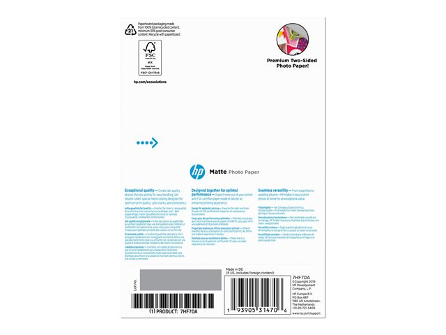 HP - Matta - 8,8 mm - 100 x 150 mm - 180 g/m² - 25 arkki (arkit) valokuvapaperi malleihin Deskjet Ink Advantage 1275; Officejet 38XX, 46XX, 52XX, 57XX, 68XX, 69XX, 80XX, 8702, 9012 7HF70A